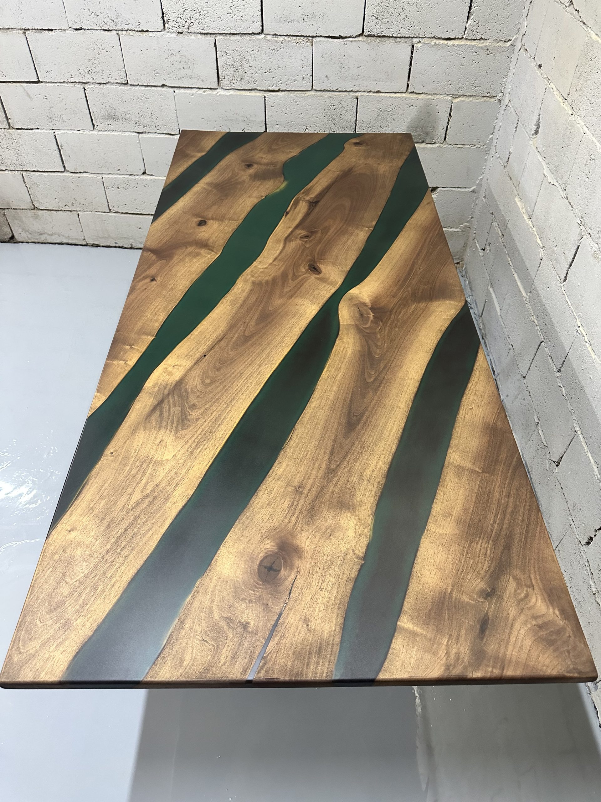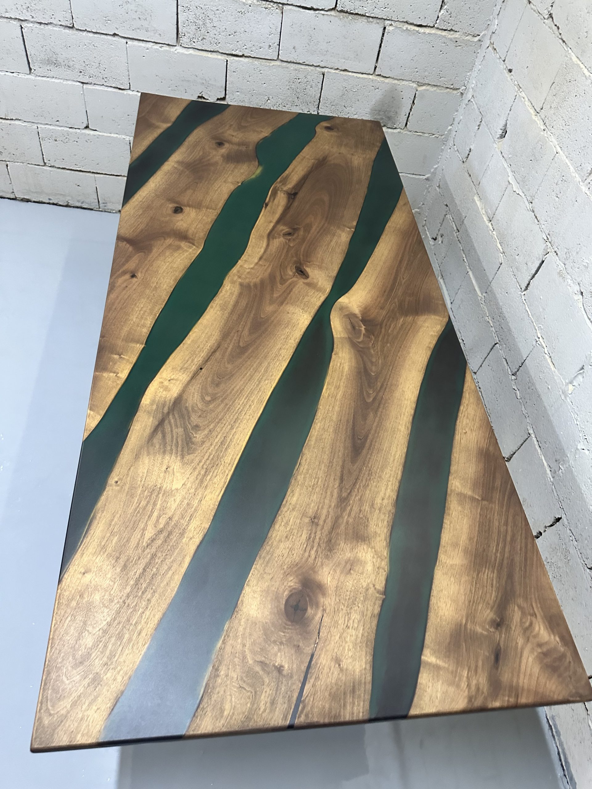 Ovaj ručno izrađeni trpezarijski sto kombinuje prirodnu lepotu orahovih dasaka sa crnom smolom prosaranom neon zutom bojom smole. Sa svojim robustnim i elegantnim dizajnom, ovaj sto je savršen dodatak svakom prostoru, pružajući jedinstven i sofisticiran izgled.