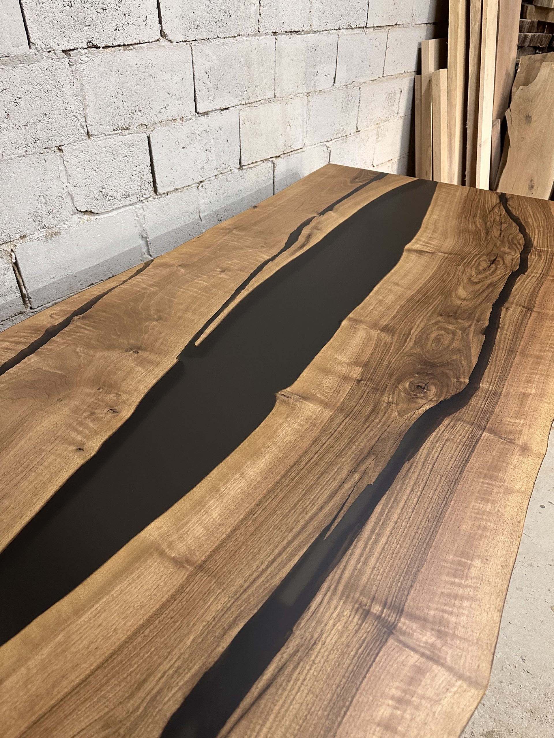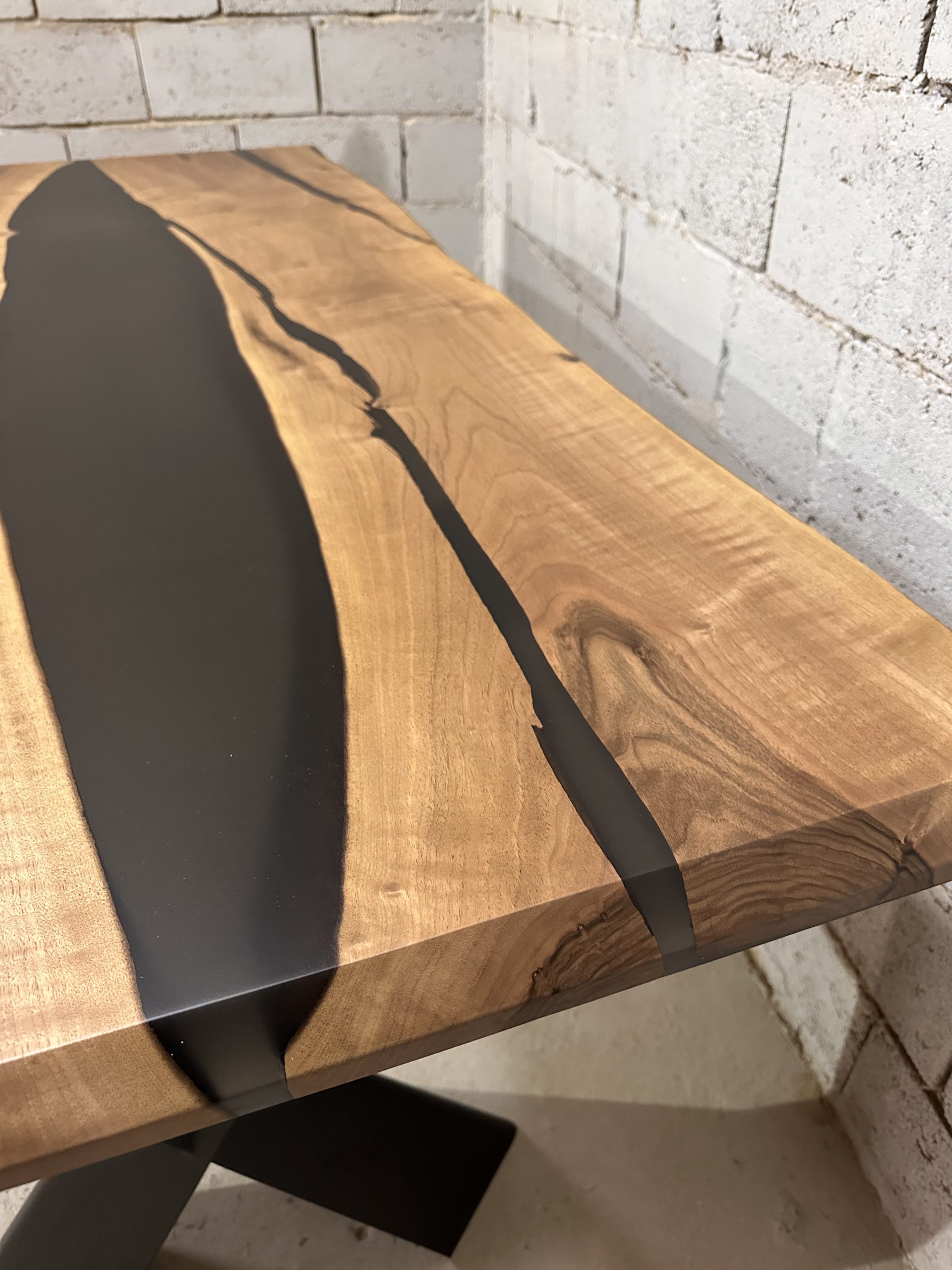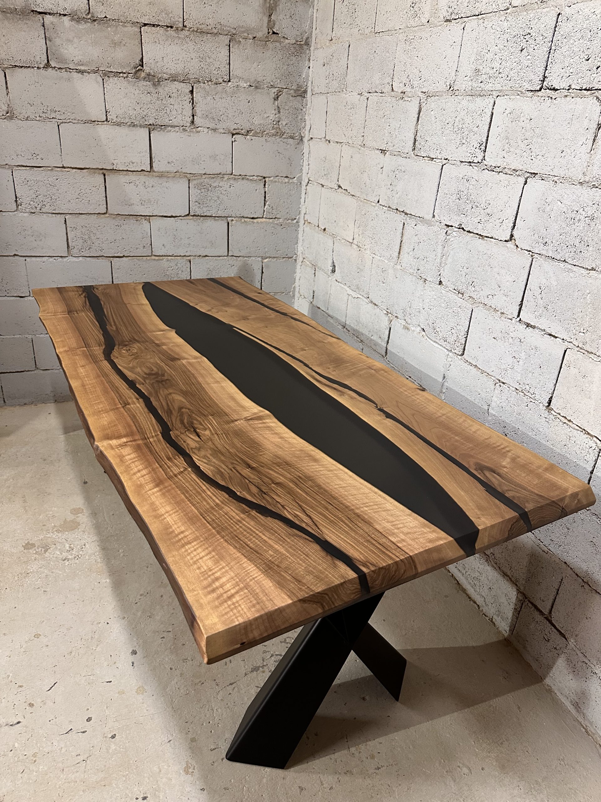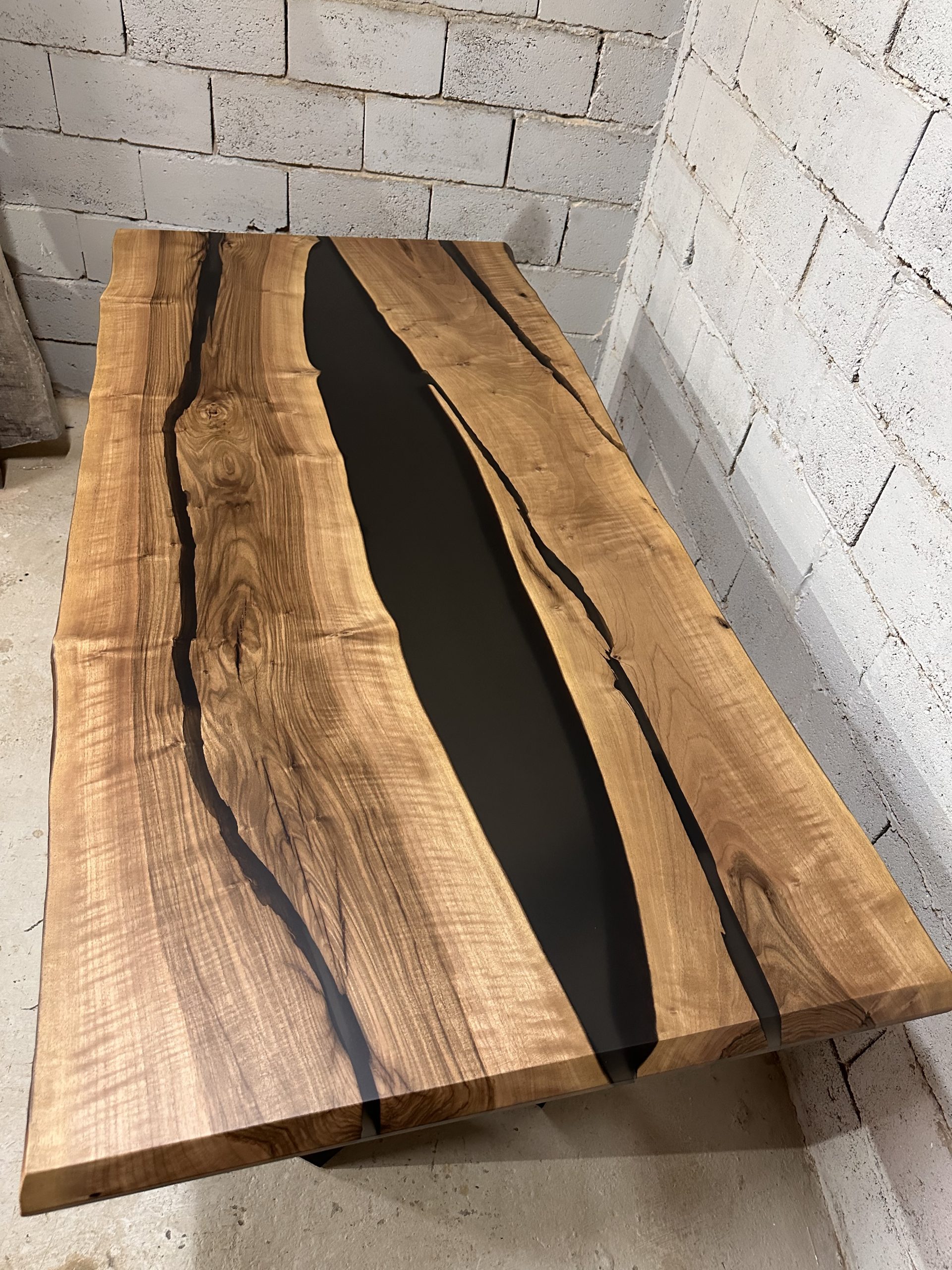 Ovaj ručno izrađeni trpezarijski sto kombinuje prirodnu lepotu orahovih dasaka e sa modernim elementima smoke black epoksi smole. Sa svojim robustnim i elegantnim dizajnom, ovaj sto je savršen dodatak svakom prostoru, pružajući jedinstven i sofisticiran izgled.