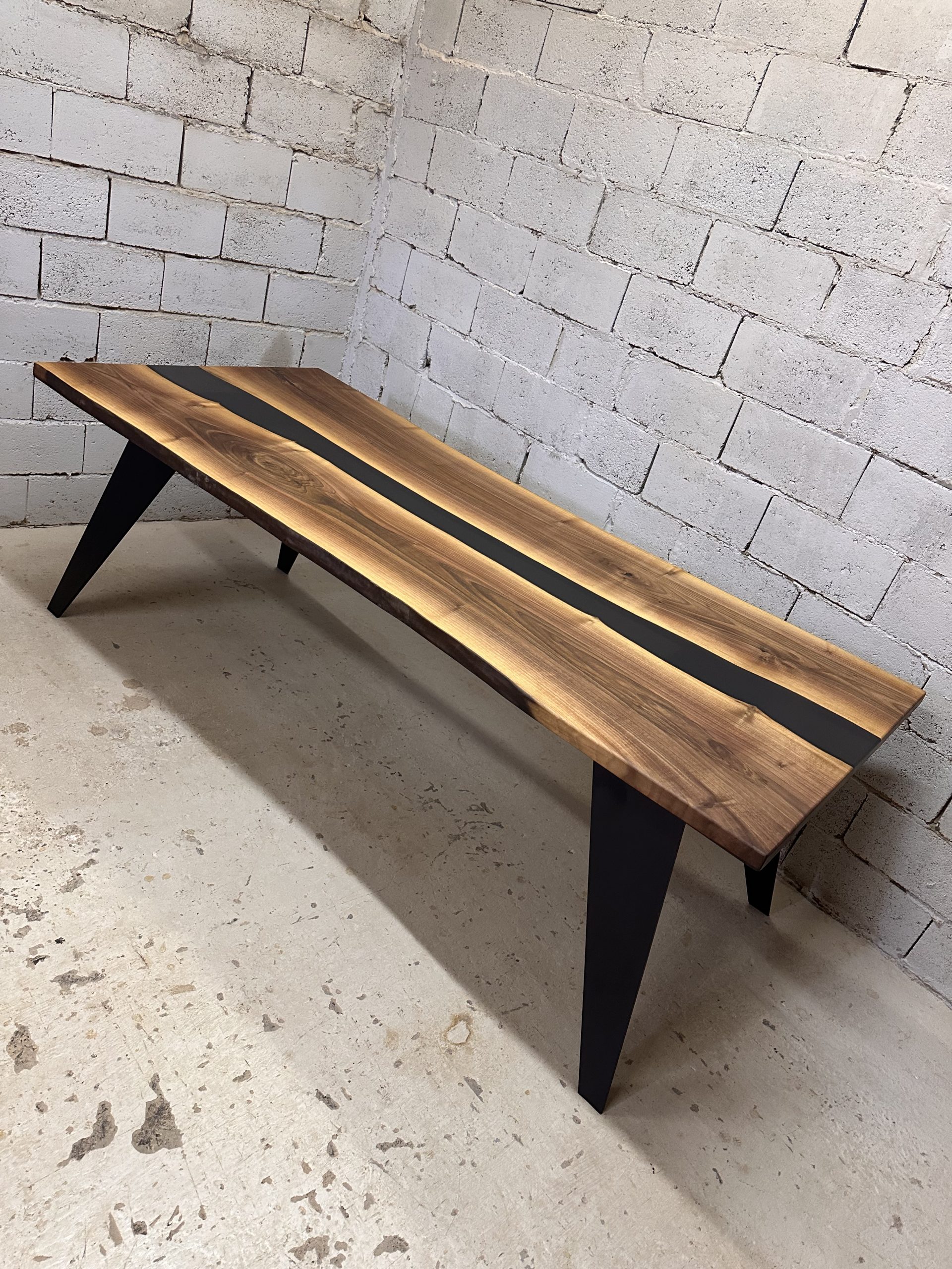Ovaj ručno izrađeni trpezarijski sto kombinuje prirodnu lepotu orahovih dasaka sa modernim elementima smoke black epoksi smole. Sa svojim robustnim i elegantnim dizajnom, ovaj sto je savršen dodatak svakom prostoru, pružajući jedinstven i sofisticiran izgled.