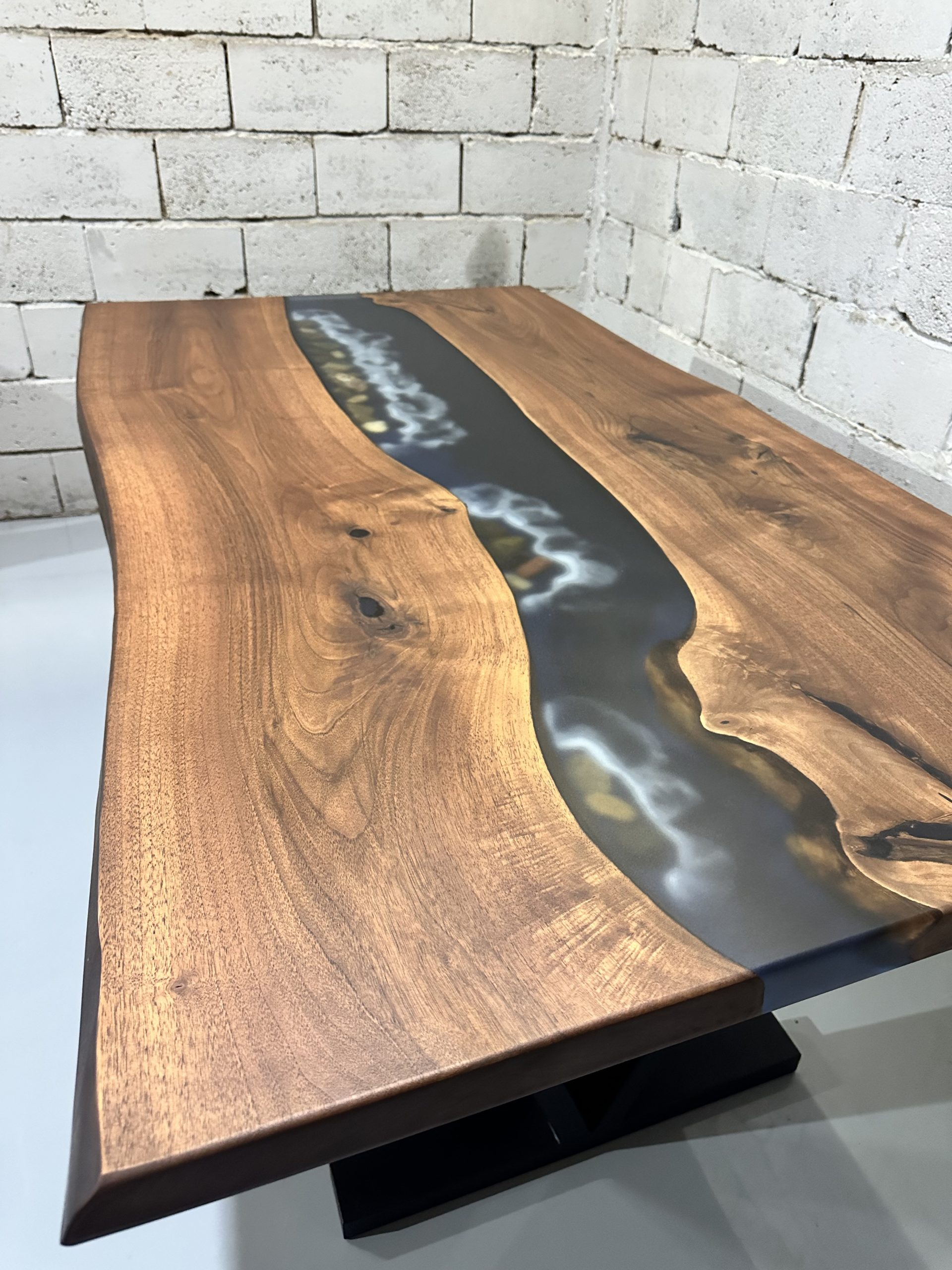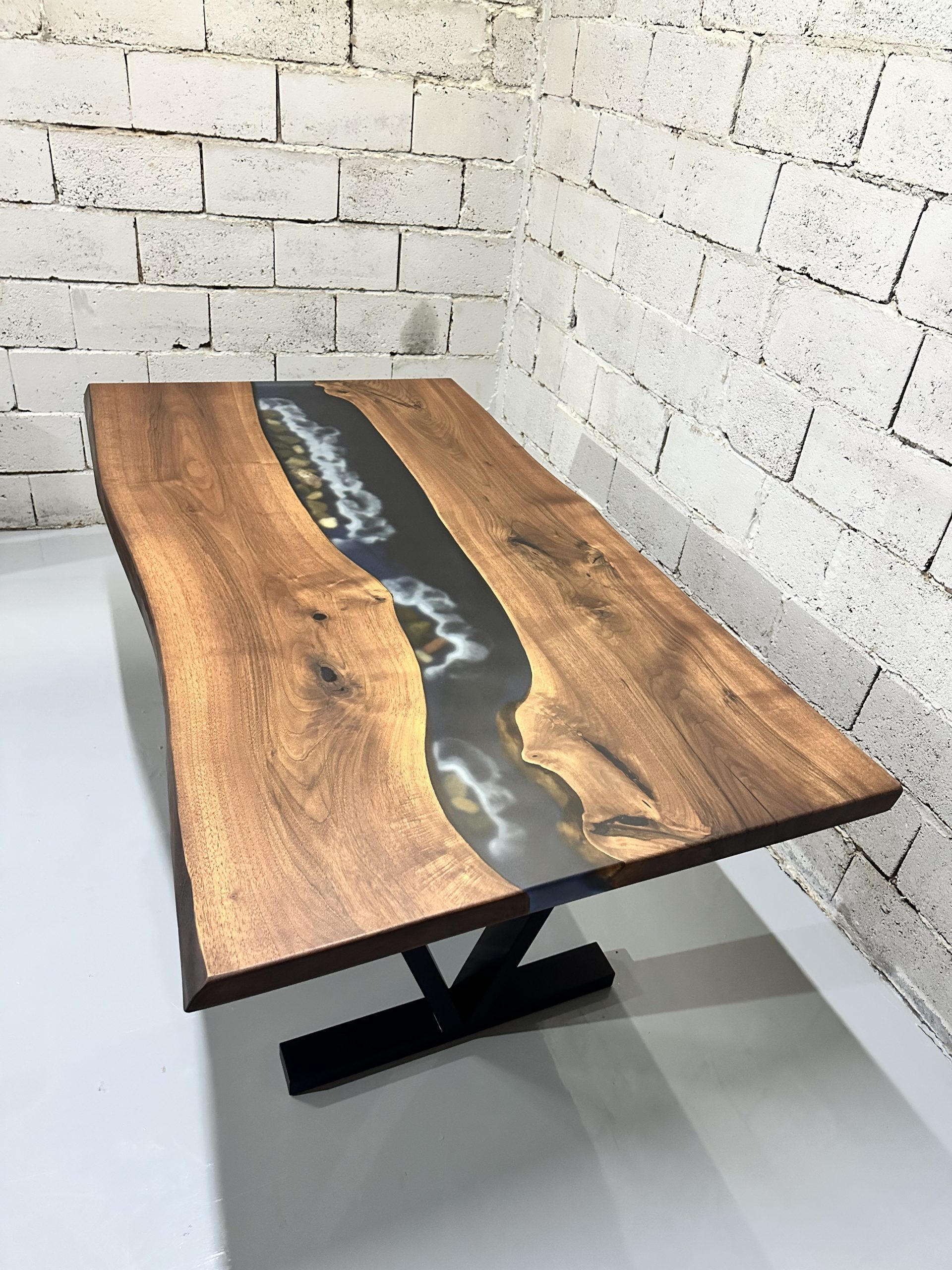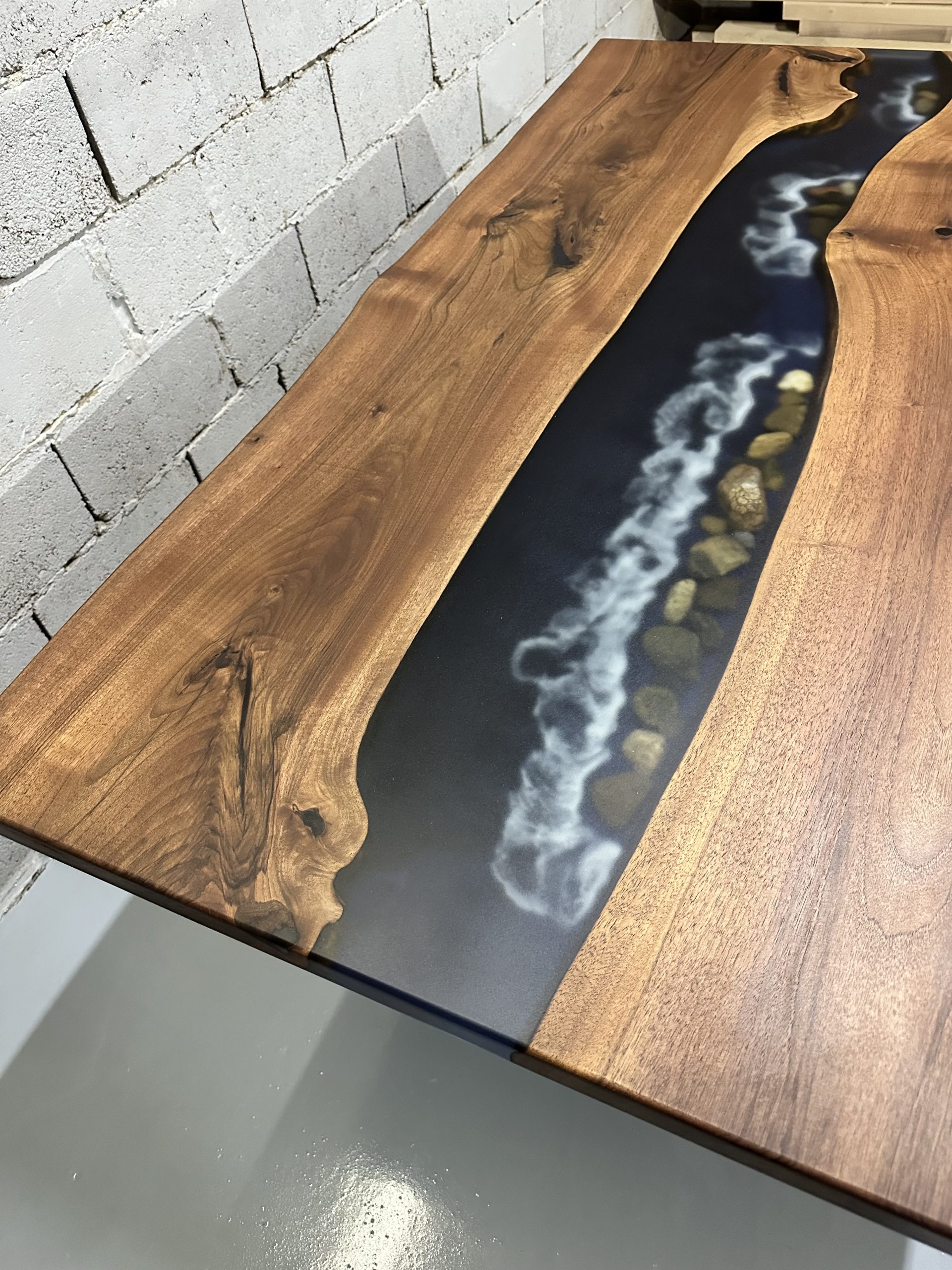 Ovaj ekskluzivni trpezarijski sto izradjen je od parenog oraha i epoksi smole sa specijalnom tehnikom imitacije talasa, koji stvara utisak krecuce vode unutar stola. U smolu su dodati prirodni dekorativni kamencici, sto dodatno naglasava utisak dubine. Ova kombinacija daje stolu snazan vizuelni identitet – idealan za moderne enterijere,luksuzne trpezarije ,poslovne prostore ili kuce sa karakterom.