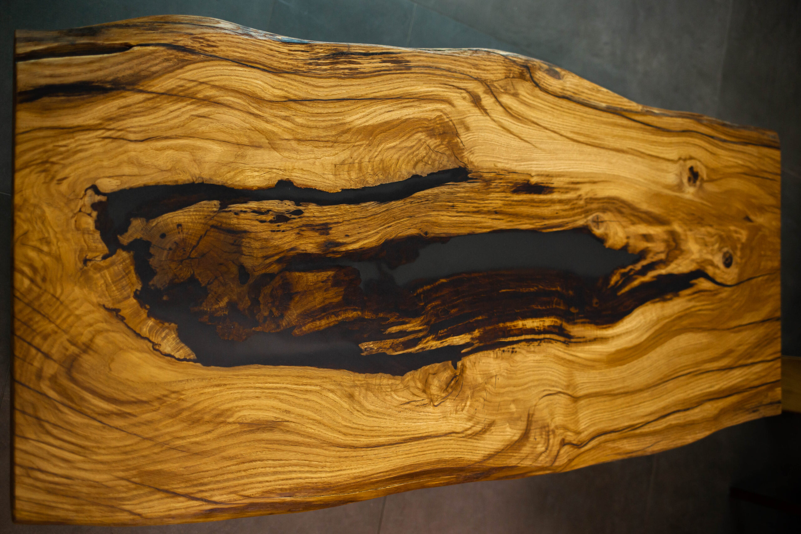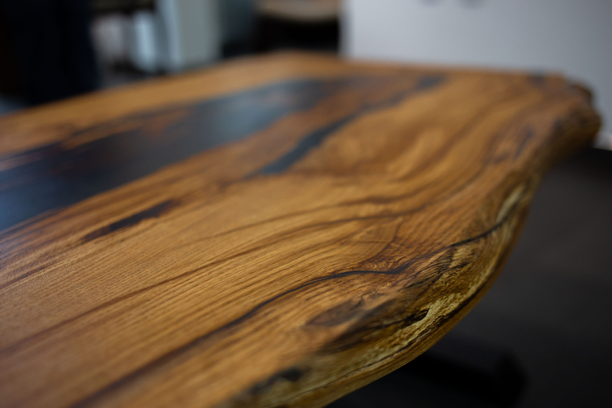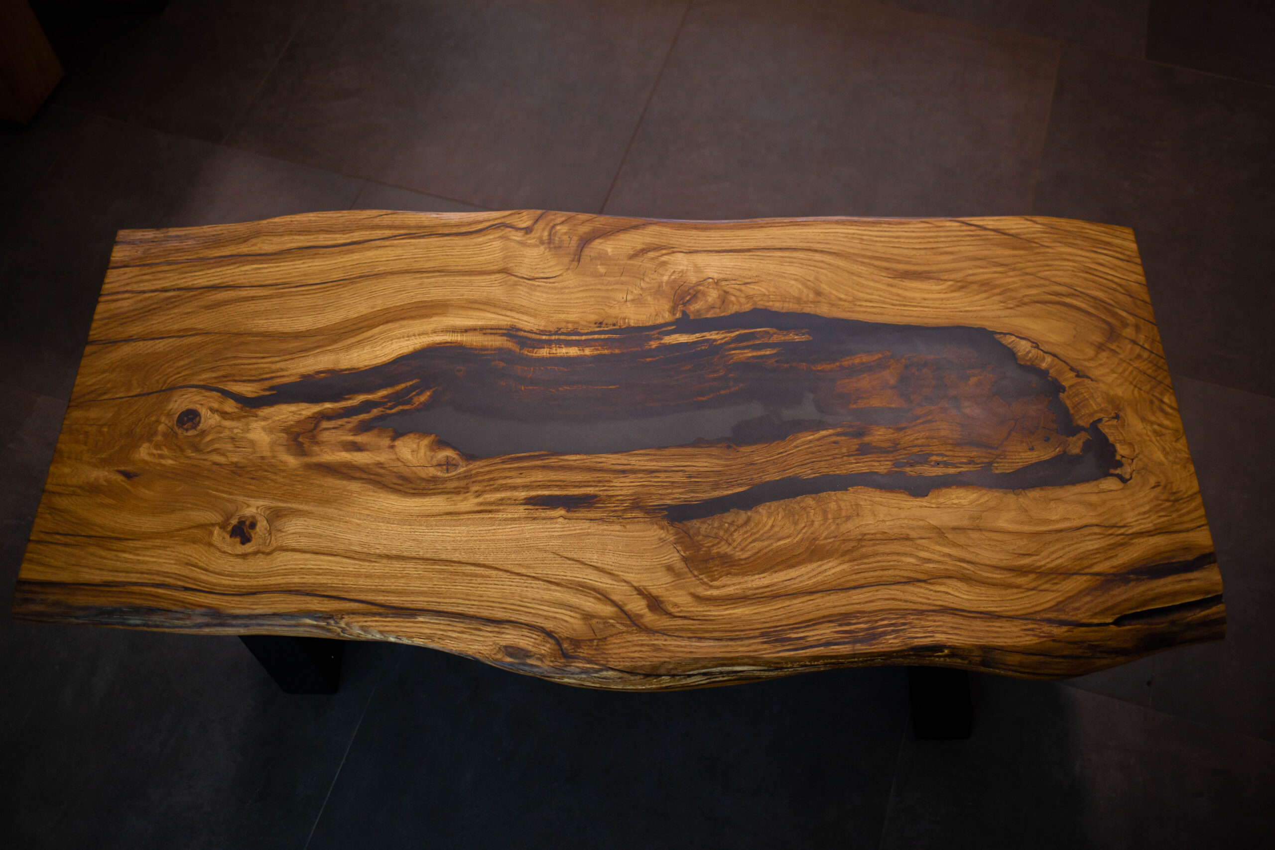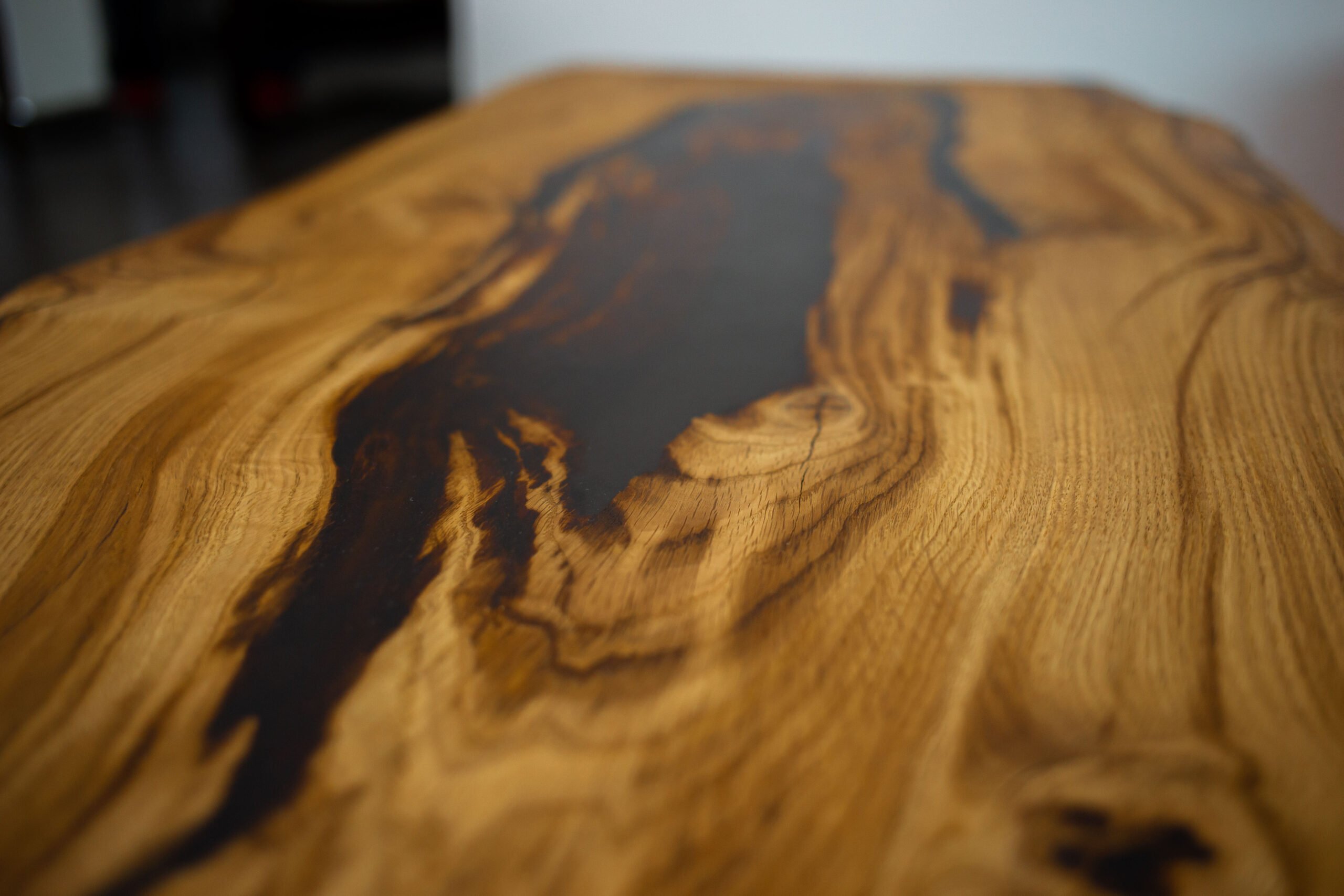 Lounge sto, izrađen od jedinstvenog komada  hrastovog drveta popunjen sa epoksi smolom  i metalnim nogarima.