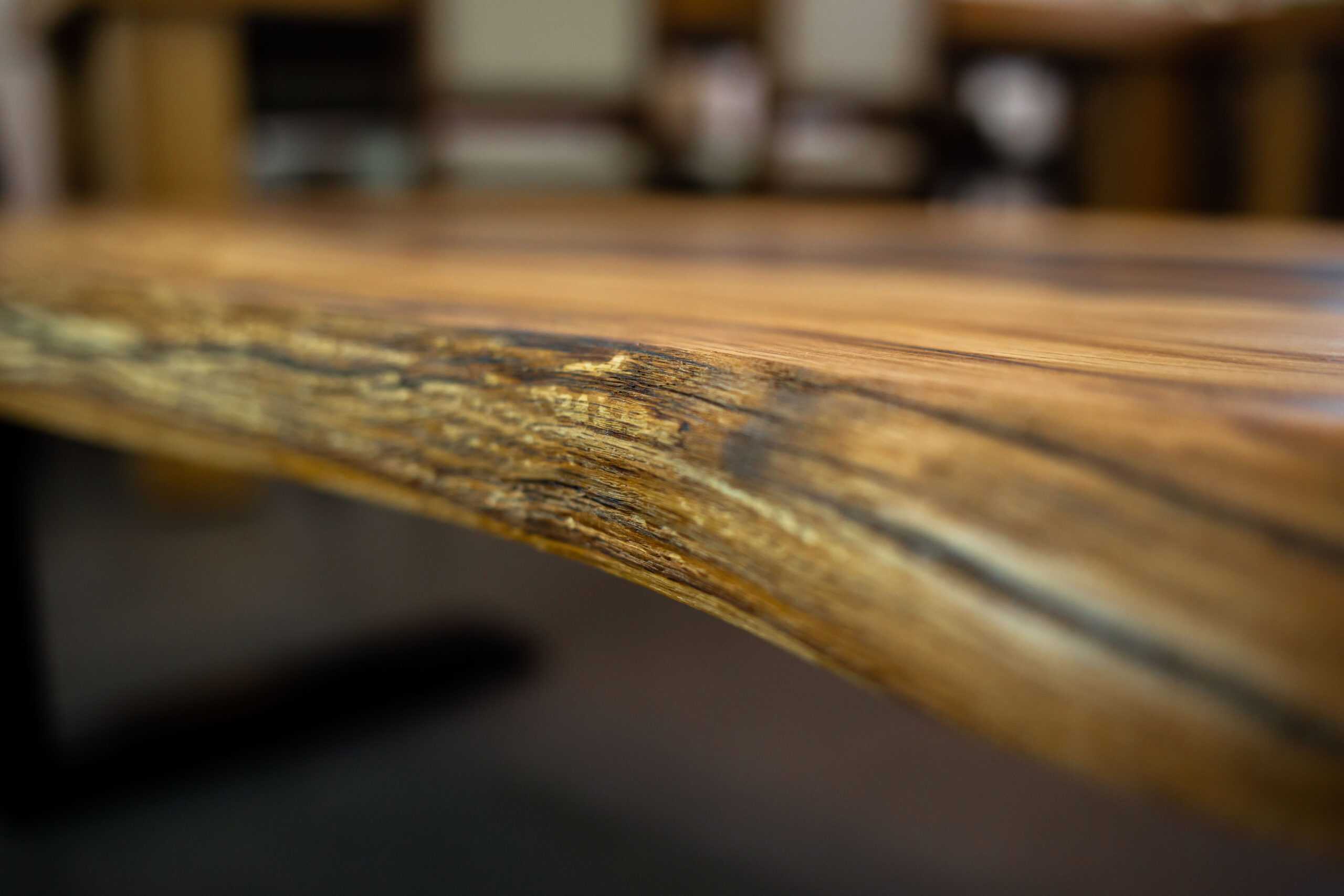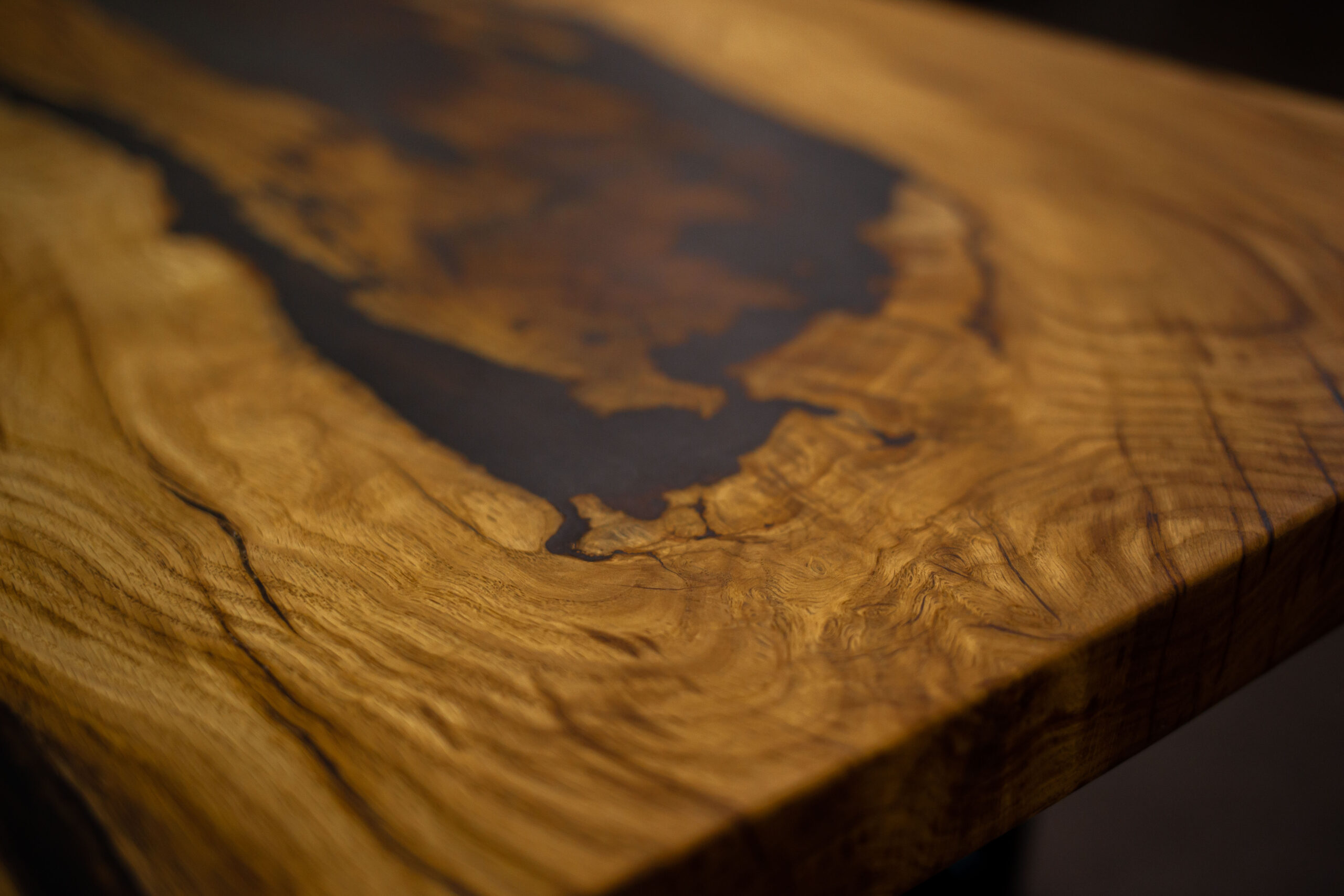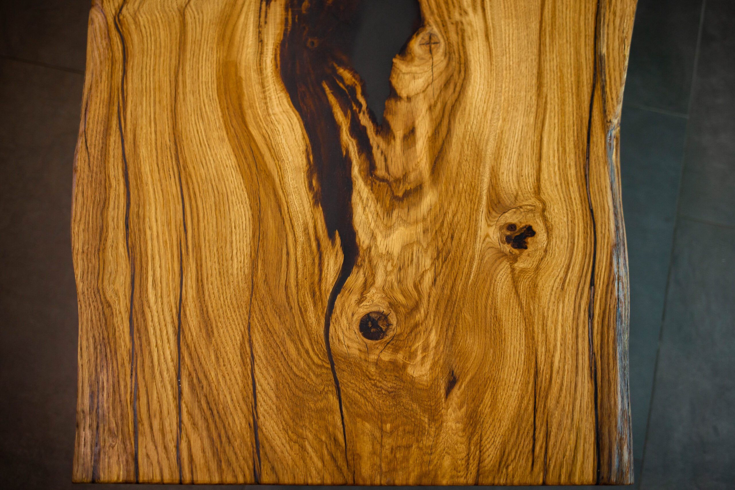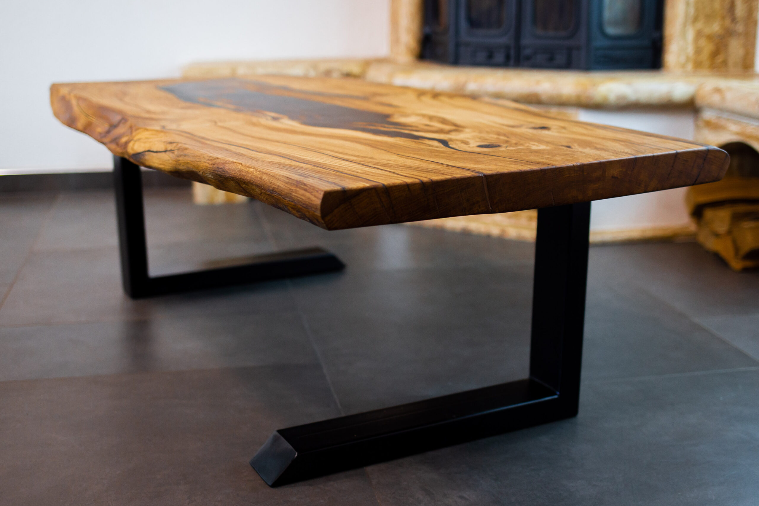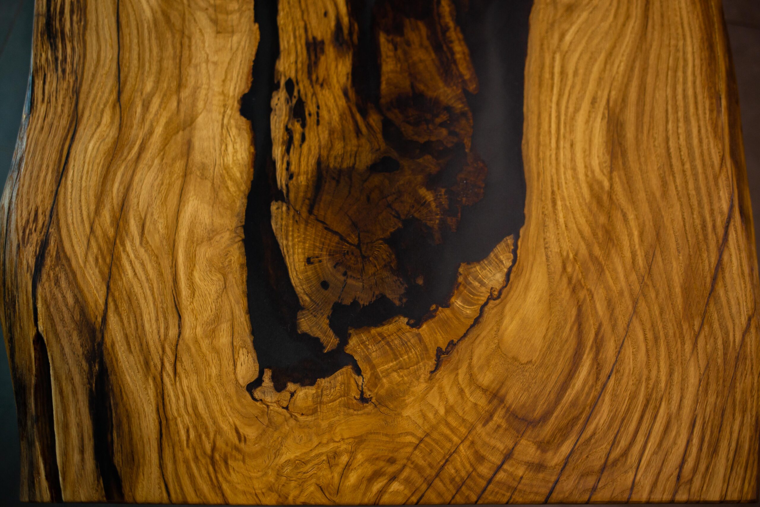 Lounge sto, izrađen od jedinstvenog komada  hrastovog drveta popunjen sa epoksi smolom  i metalnim nogarima.
