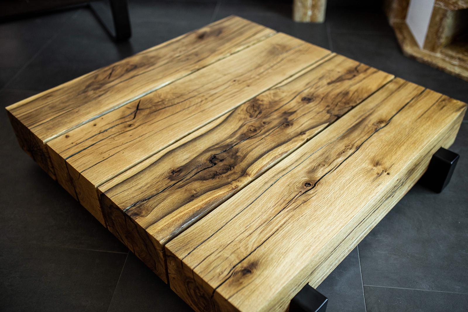 Lounge sto, izrađen od hrastovih greda, dimenzije 100x100cm sa metalnim nogarima.