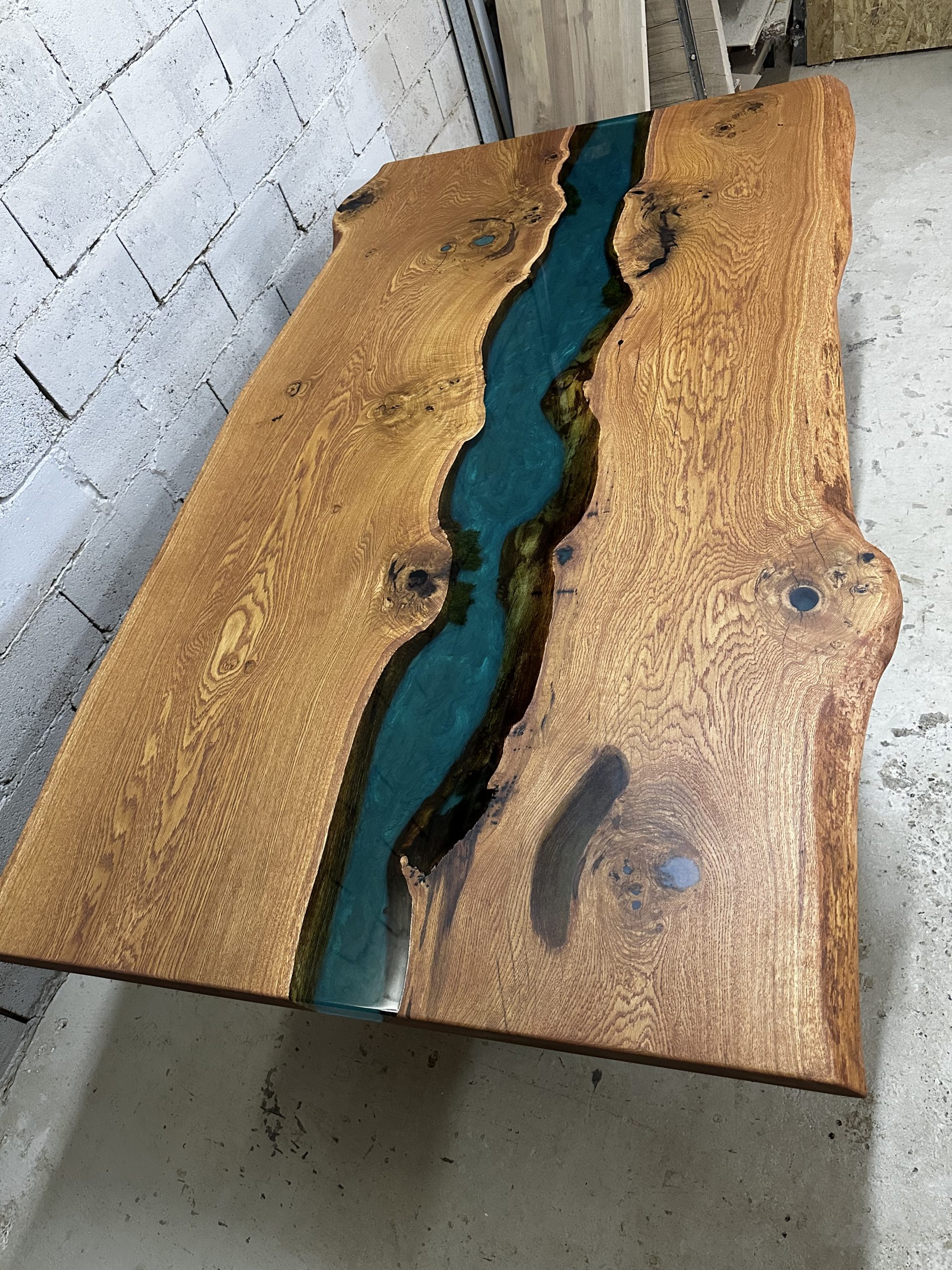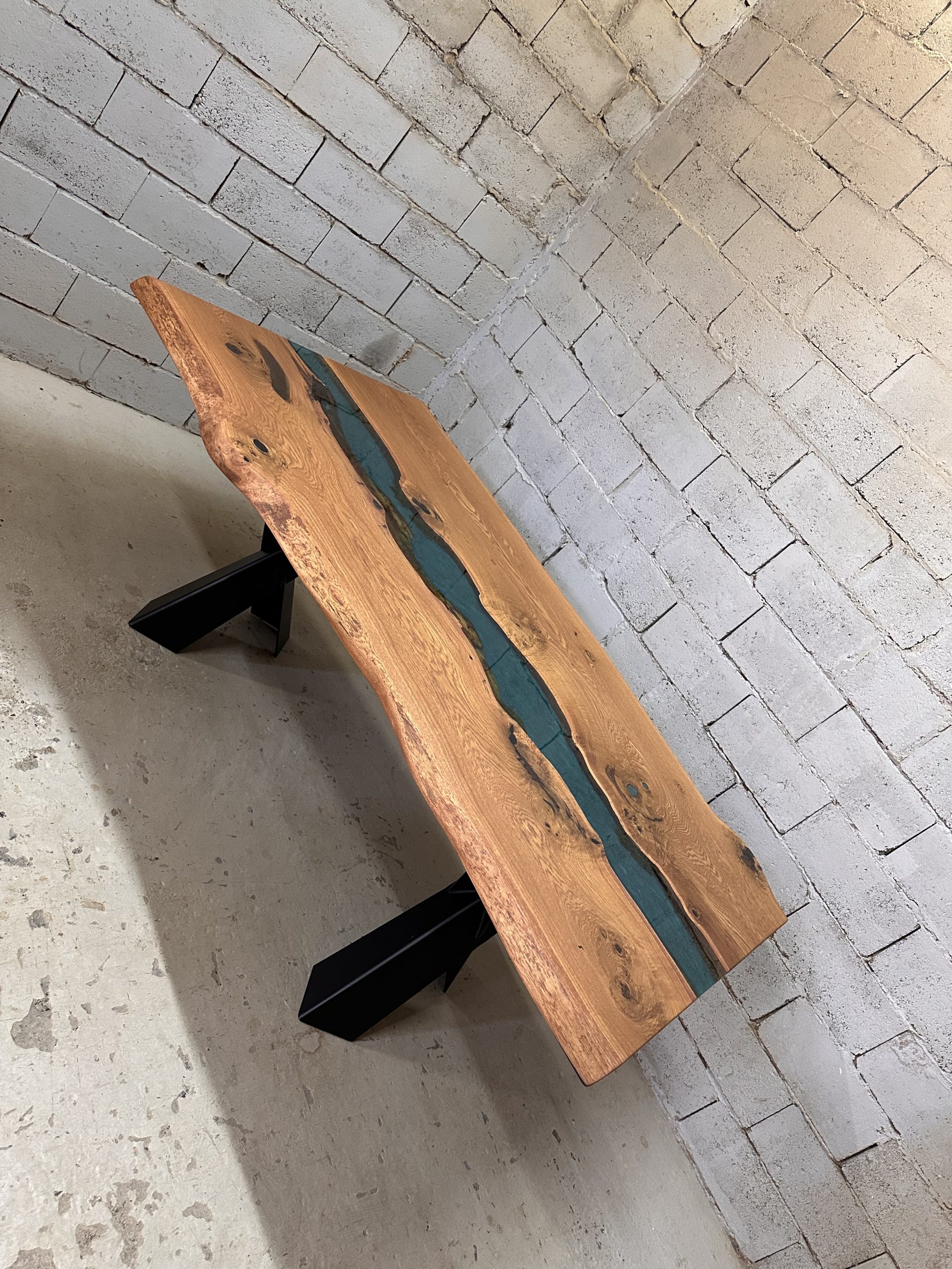 PND Trpezarijski Sto Nr.52 , Izrađen od čvrstog hrasta i premium epoksi smole, ovaj sto garantuje dugovečnost i izdržljivost,moderni dizajn sa tirkizno-zelenom epoksi smolom savršeno dopunjuje bilo koji enterijer, dodajući luksuzan i osvežavajući izgled.