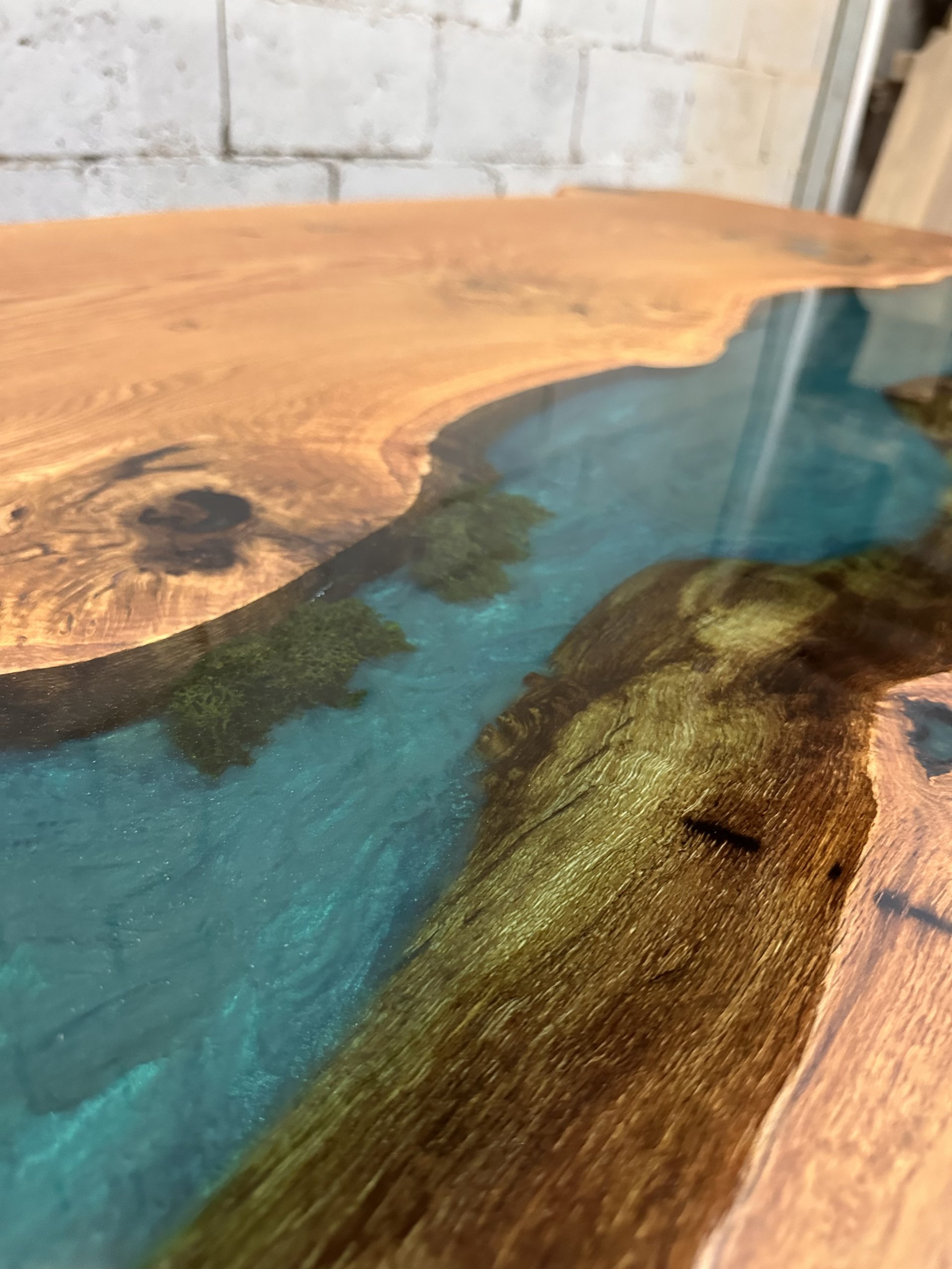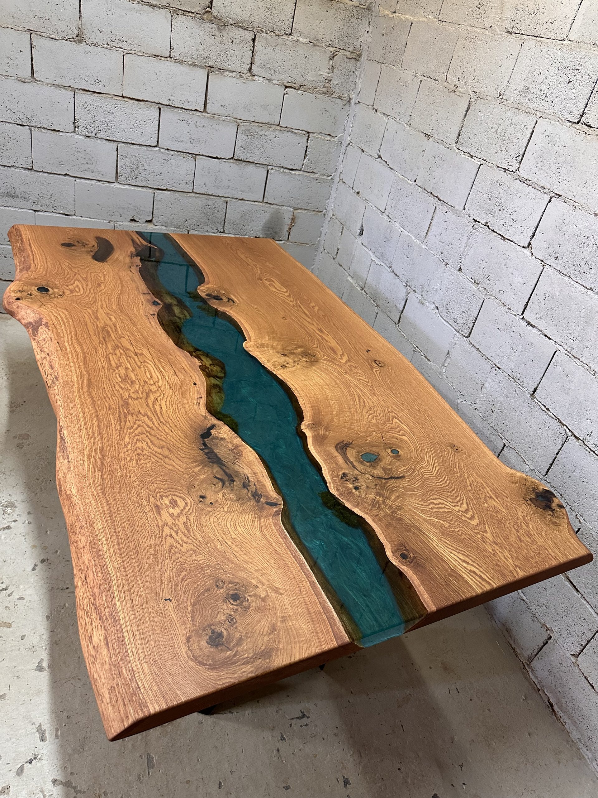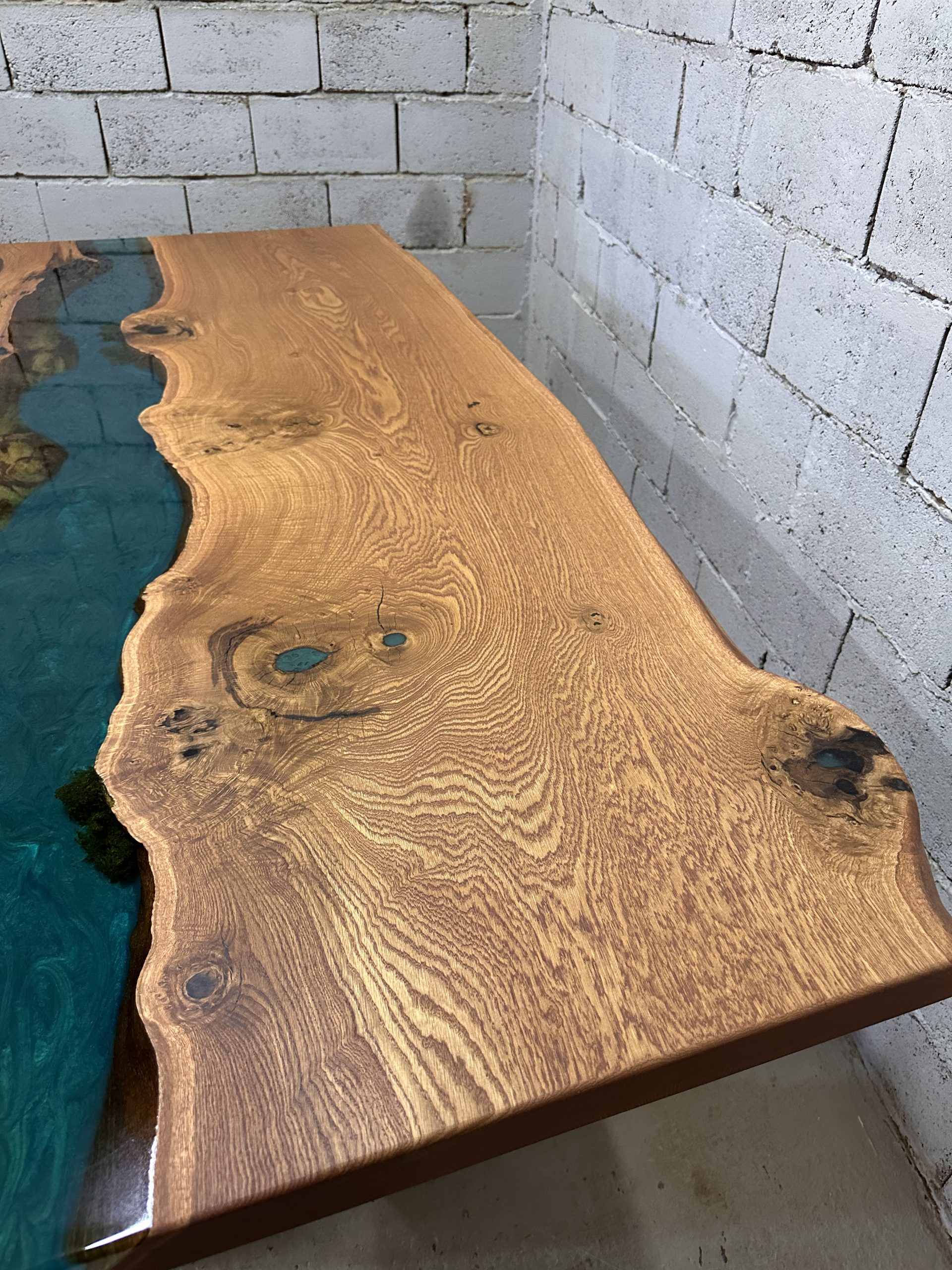 Ovaj ručno izrađeni trpezarijski sto kombinuje prirodnu lepotu hrasta sa modernim i vibrantnim elementima tirkizno-zelene providne epoksi smole. Dizajniran sa predivnim tirkizno-zelenim detaljima koje prolaze kroz sto, ovaj sto je ne samo funkcionalan već i zapanjujuće umetničko delo. Idealno za dodavanje svežine i elegancije u bilo koju trpezariju.