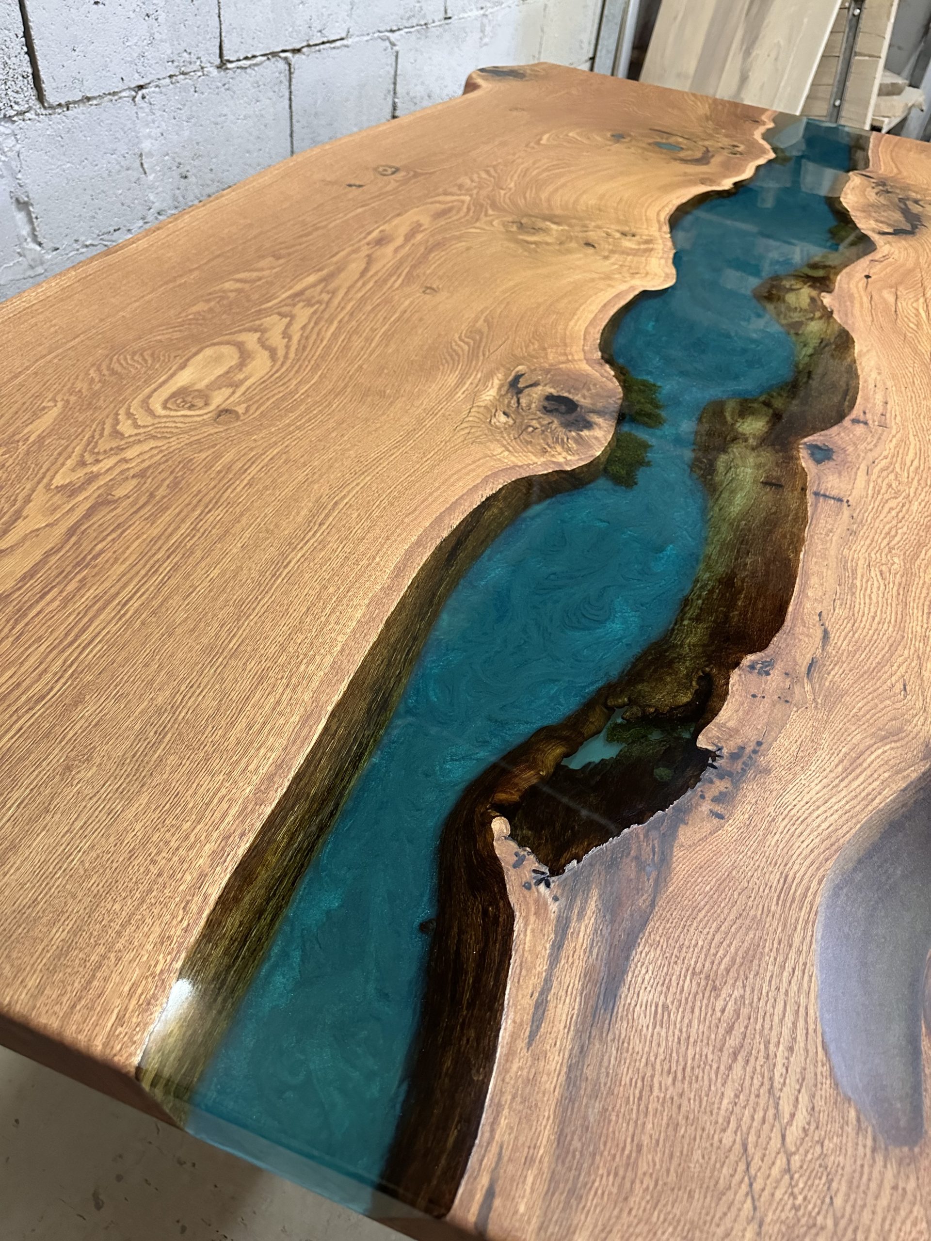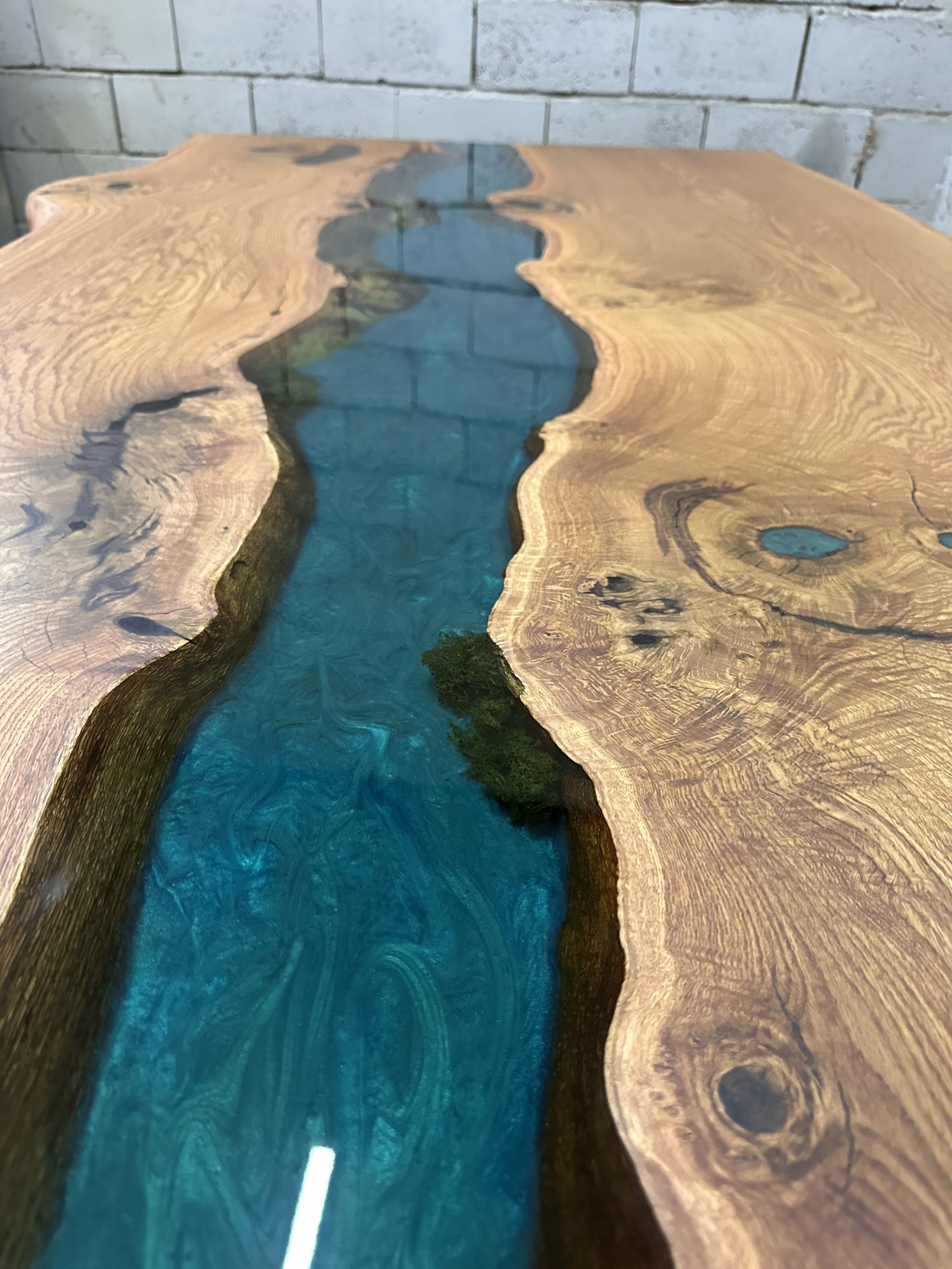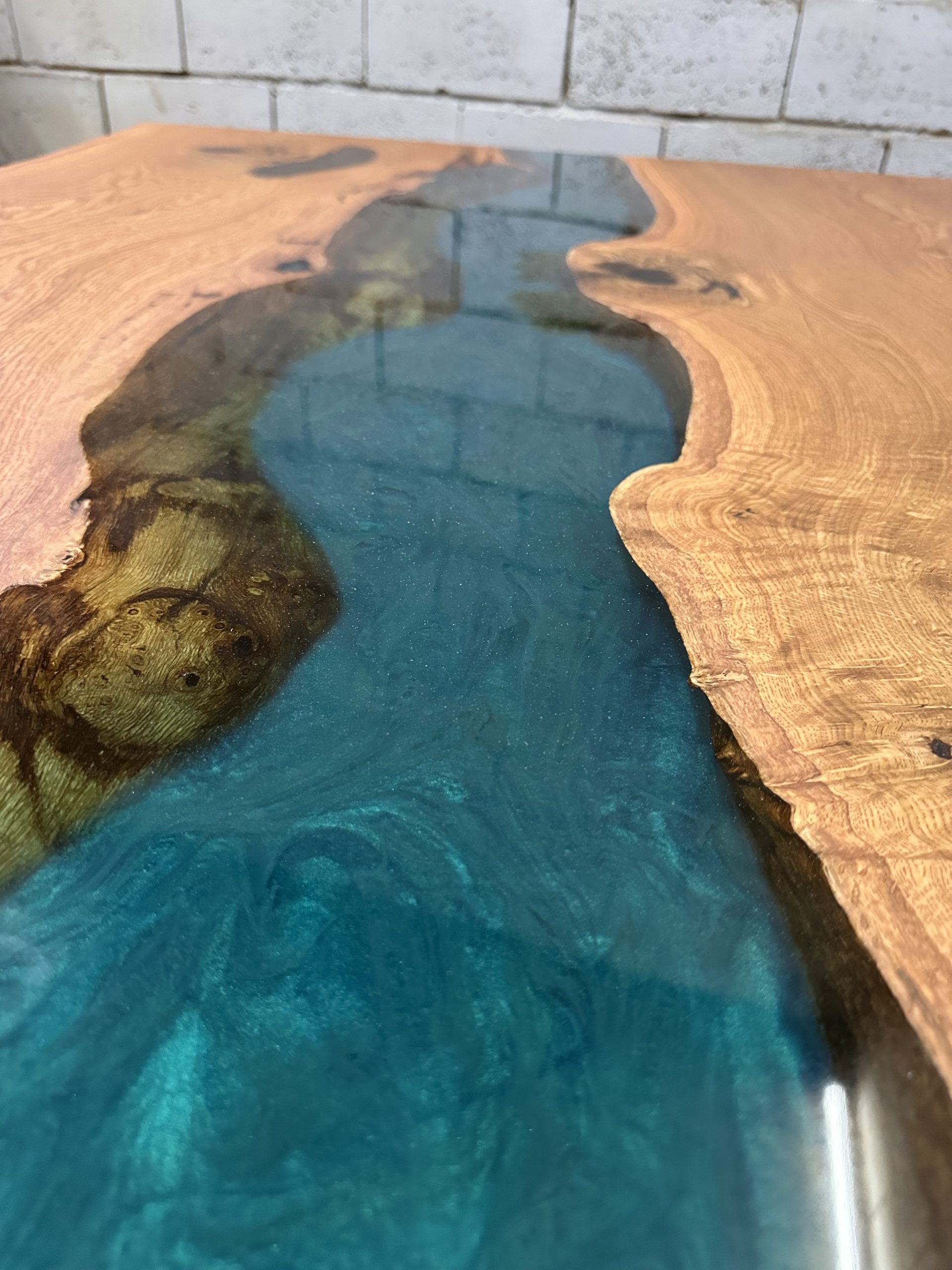 Ovaj ručno izrađeni trpezarijski sto kombinuje prirodnu lepotu hrasta sa modernim i vibrantnim elementima tirkizno-zelene providne epoksi smole. Dizajniran sa predivnim tirkizno-zelenim detaljima koje prolaze kroz sto, ovaj sto je ne samo funkcionalan već i zapanjujuće umetničko delo. Idealno za dodavanje svežine i elegancije u bilo koju trpezariju.